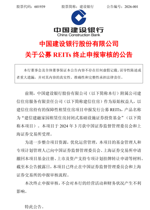 近日,建设银行(601939)、万科A、金风科技(002202)、电子城(600658)等头部企业,相继宣布 主动撤回或终止公募REITs的发行申请。 中国证券报记者了解到,近期多个公募REITs的"战略性撤退",或是监管新规落地、市场环境变化及企 业自身战略调整共同作用的结果,也预示着公募REITs市场正从"扩容提速"转向更加注重资产质量、估 值逻辑深度重构的新发展阶段。 多家公司撤回REITs申报 1月23日,建设银行公告称,前期,该行附属公司建信住房作为原始权益人,以建信住房持有的保障性 租赁住房项目申报发行公募REITs。该项目于2024年3月获中国证券监督管理委员会和上海证券交易所 受理。为进一步整合项目资源,优化运营管理,该项目的基金管理人和专项计划管理人主动申请撤回申 报材料。截至2026年1月23日,该项目已终止申报审核流程。 图片来源:建设银行公告 建设银行表示,本次终止申报审核,不会对该行的经营活动和财务状况产生不利影响。 记者就该项目终止的原因、未来发展规划等问题向建设银行发函采访。截至记者发稿,该行未予以明确 回应。记者注意到,此次公募REITs撤回或正处于建信住房经营发展的关键阶段, ...