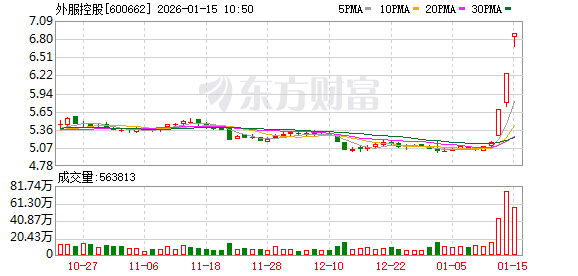 外服控股盘中涨停,已连收3个涨停板,截至9:32,该股报6.88元,换手率2.06%,成交量4693.71万股, 成交金额3.21亿元,涨停板封单金额为2.49亿元。连续涨停期间,该股累计上涨33.33%,累计换手率为 7.32%。最新A股总市值达157.10亿元,A股流通市值156.62亿元。 证券时报·数据宝统计,两融数据来看,该股最新(1月14日)两融余额为1.83亿元,其中,融资余额 1.82亿元,较前一个交易日增加1938.62万元,环比增长11.90%,近3日累计减少1.62万元,环比下降 0.01%。 | 日期 | 当日涨跌幅(%) | 换手率(%) | 主力资金净流入(万元) | | --- | --- | --- | --- | | 2026.01.14 | 10.04 | 3.33 | 4902.62 | | 2026.01.13 | 10.08 | 1.93 | 7104.56 | | 2026.01.12 | 1.38 | 0.68 | -940.39 | | 2026.01.09 | 0.99 | 0.49 | -434.96 | | 2026.01.08 | 0.00 | 0.52 ...