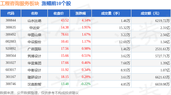从资金流向上来看,当日工程咨询服务板块主力资金净流出7.75亿元,游资资金净流入2.89亿元,散户资 金净流入4.86亿元。工程咨询服务板块个股资金流向见下表: 证券之星消息,2月2日工程咨询服务板块较上一交易日下跌2.95%,太极实业领跌。当日上证指数报收 于4015.75,下跌2.48%。深证成指报收于13824.35,下跌2.69%。工程咨询服务板块个股涨跌见下表: | 代码 | 名称 | 收盘价 | 涨跌幅 | 成交量(手) | 成交额(元) | | | --- | --- | --- | --- | --- | --- | --- | | 300844 | 山水比德 | 43.52 | 4.14% | 1.46万 | | 6219.72万 | | 300635 | 中达安 | 14.38 | 1.91% | 15.32万 | | 2.31亿 | | 300492 | 华图山鼎 | 78.61 | 1.67% | 3.22万 | | 2.56亿 | | 002883 | 中设股份 | 10.41 | 1.17% | 12.69万 | | 1.34亿 | | 920892 | 广咨国际 | 17.56 ...