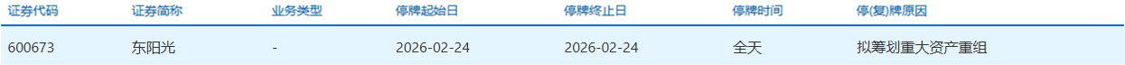 中国经济网北京2月24日讯 据上交所消息,东阳光(600673.SH)今日停牌,停牌原因为拟筹划重大资产重组。 前一交易日即2026年2月13日,东阳光盘中最高报38.36元,股价创历史新高。 (责任编辑:田云绯) | 证券代码 | 证券简称 | 业务类型 | 停牌起始日 | 停牌终止日 | 停牌时间 | 停(复)牌原因 | | --- | --- | --- | --- | --- | --- | --- | | 600673 | 东阳光 | | 2026-02-24 | 2026-02-24 | 全天 | 拟筹划重大资产重组 | ...