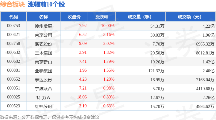 证券之星消息,10月10日综合板块较上一交易日下跌1.19%,东阳光领跌。当日上证指数报收于 3897.03,下跌0.94%。深证成指报收于13355.42,下跌2.7%。综合板块个股涨跌见下表: 从资金流向上来看,当日综合板块主力资金净流出3.58亿元,游资资金净流入2027.2万元,散户资金净流 入3.37亿元。综合板块个股资金流向见下表: | 代码 | 名称 | 收盘价 | 涨跌幅 | 成交量(手) | 成交额(元) | | --- | --- | --- | --- | --- | --- | | 000753 | 漳州发展 | 7.92 | 10.00% | 54.31万 | 4.22亿 | | 000421 | 南京公用 | 6.52 | 3.16% | 30.03万 | 1.96亿 | | 002758 | 浙农股份 | 9.09 | 2.02% | 7.70万 | 6965.32万 | | 000632 | 三木集团 | 3.91 | 1.82% | 20.50万 | 8012.81万 | | 600682 | 南京新白 | 7.41 | 1.79% | 19.26万 | 1.42亿 | | ...