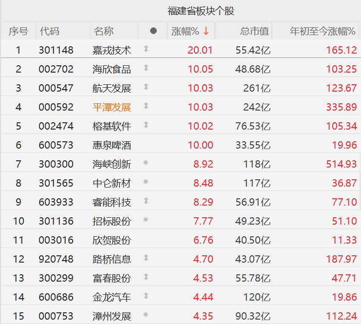 MACD金叉信号形成,这些股涨势不错! | | | | | 福建省板块个股 | | | | --- | --- | --- | --- | --- | --- | --- | | 序号 | 代码 | 名称 | 0 | 涨幅%↓ | 总市值 | 年初至今涨幅%。 | | 1 | 301148 | 嘉戎技术 | 1 | 20.01 | 55.42亿 | 165.12 | | 2 | 002702 | 海欣食品 | 1 | 10.05 | 48.68 乙 | 103.25 | | 3 | 000547 | 航天发展 | 1 | 10.03 | 261亿 | 123.67 | | ব | 000592 | 平潭发展 | 1 | 10.03 | 242亿 | 335.89 | | 5 | 002474 | 榕基软件 | 1 | 10.02 | 76.53亿 | 105.34 | | 6 | 600573 | 惠泉啤酒 | | 10.00 | 33.55 Z | 19.96 | | 7 | 300300 | 海峡创新 | - | 8.92 | 118亿 | 514.93 | | 8 | 301565 | 中仑新材 | 资 ...