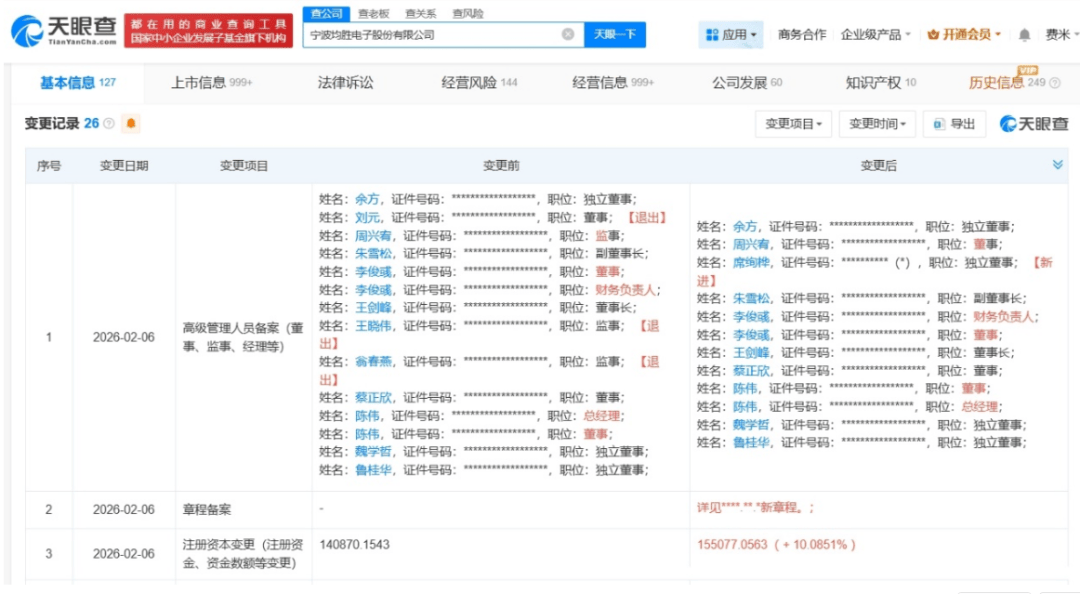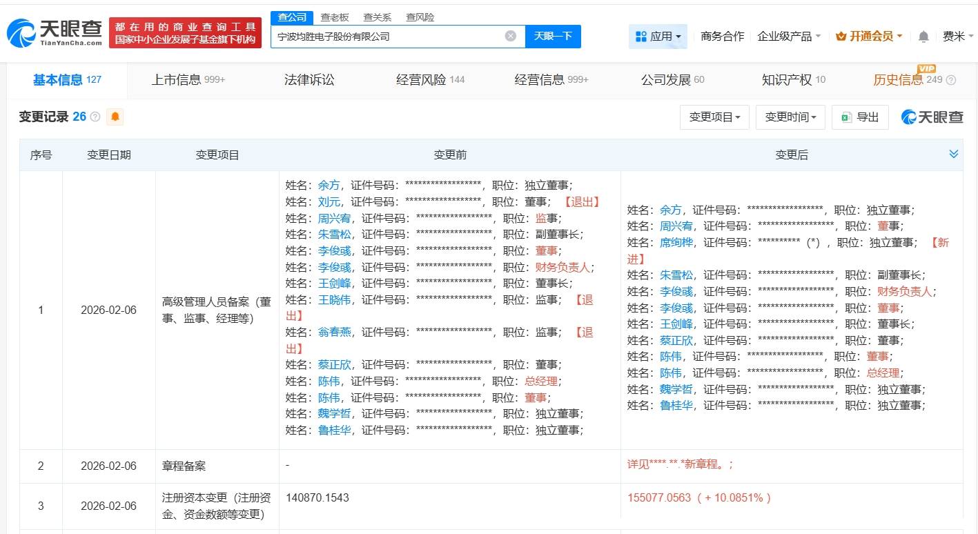 天眼查App显示,2月6日,均胜电子发生工商变更,注册资本由约14.1亿人民币增至约15.5亿人民币, 增幅约10%。宁波均胜电子股份有限公司成立于1992年8月,法定代表人为王剑峰,经营范围包括模具 设计、制造、加工,制造业项目投资,从事货物及技术的进出口业务等。股东信息显示,该公司由均胜 集团有限公司、香港中央结算有限公司、王剑峰等共同持股。 ...
