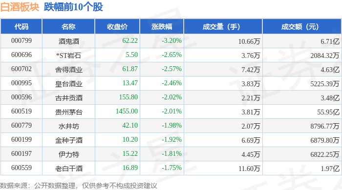 证券之星消息,10月17日白酒板块较上一交易日下跌1.79%,酒鬼酒领跌。当日上证指数报收于 3839.76,下跌1.95%。深证成指报收于12688.94,下跌3.04%。白酒板块个股涨跌见下表: 从资金流向上来看,当日白酒板块主力资金净流出11.73亿元,游资资金净流入6.88亿元,散户资金净流 入4.85亿元。白酒板块个股资金流向见下表: 以上内容为证券之星据公开信息整理,由AI算法生成(网信算备310104345710301240019号),不构成投资建议。 | 代码 | 名称 | 收盘价 | 涨跌幅 | 成交量(手) | 成交额(元) | | --- | --- | --- | --- | --- | --- | | 000799 | 织思察 | 62.22 | -3.20% | 10.66万 | 6.71亿 | | 600696 | *ST岩石 | 5.50 | -2.65% | 3.76万 | 2084.32万 | | 600702 | 舍得酒业 | 61.87 | -2.57% | 7.42万 | 4.63亿 | | 000995 | 皇台酒业 | 13.47 | -2.46% | - 3.8 ...