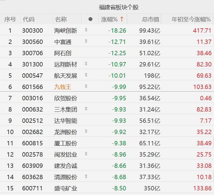 A股福建股集体下挫,海峡创新跌18%,中富通、阿石创跌12%,航天发展、九牧王、欣贺股份、三木集团、达华智能、龙洲股份10CM跌停