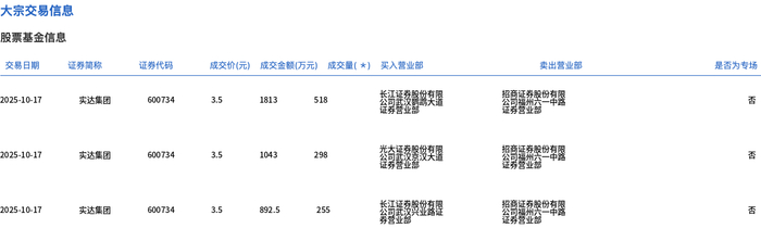 10月21日,实达集团大宗交易成交1168万股,成交额4029.6万元,占当日总成交额的25.15%,成交价 3.45元,较市场收盘价3.45元持平。 | 交易日期 | 证券简称 | 证券代码 | | | 成交价(元) 成交金额(万元) 成交量( *) 买入营业部 | | 类出营业部 | 是否为专场 | | | --- | --- | --- | --- | --- | --- | --- | --- | --- | --- | | 2025-10-21 | 英达集团 | 600734 | 3.45 | 2235.6 | 648 | 委员会议 - 1 | 程易量器学奖图 | | 客 | | 2025-10-21 | 实达集团 | 600734 | 3.45 | 1794 | 520 | 藝學園發展家 | 委員會發展。 | | Ka | ...