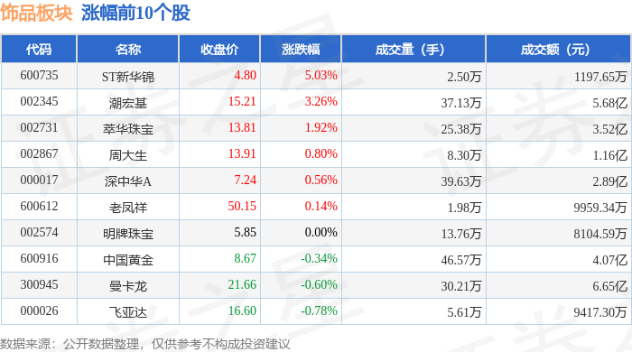 饰品板块10月16日涨0.03%,ST新华锦领涨,主力资金净流入2275.43万元