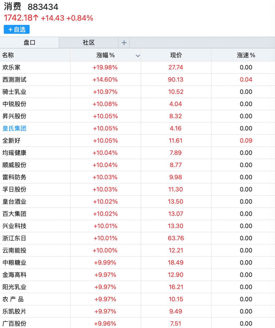 | 참□ | 社区 + | | | | --- | --- | --- | --- | | 名称 | 涨幅% > | 现价 | 涨速 % | | 欢乐家 | +19.98% | 27.74 | 0.00 | | 西测测试 | +14.60% | 90.13 | 0.04 | | 骑士凯尔 | +10.97% | 10.52 | 0.00 | | 中锐股份 | +10.08% | 4.04 | 0.00 | | 营兴股份 | +10.05% | 8.32 | 0.00 | | 皇氏集团 | +10.05% | 4.16 | 0.00 | | 全新好 | +10.05% | 11.61 | 0.09 | | 均瑶健康 | +10.04% | 7.89 | 0.00 | | 顺威股份 | +10.04% | 8.77 | 0.00 | | 雷科防务 | +10.03% | 9.98 | 0.00 | | 幸日股份 | +10.03% | 11.30 | 0.00 | | 壹号湿亦 | +10.02% | 13.50 | 0.00 | | 百大集团 | +10.02% | 13.07 | 0.00 | | 兴业科技 ...