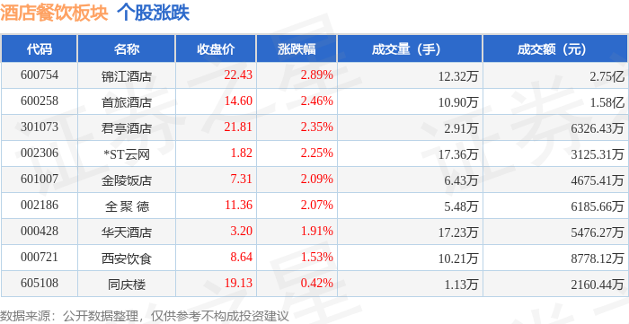 证券之星消息,10月21日酒店餐饮板块较上一交易日上涨0.04%,*ST云网领涨。当日上证指数报收于 3916.33,上涨1.36%。深证成指报收于13077.32,上涨2.06%。酒店餐饮板块个股涨跌见下表: | 代码 | 名称 | 主力净流入(元) | 主力净占比 游资净流入 (元) | | 游资净占比 散户净流入 (元) | | 散户净占比 | | --- | --- | --- | --- | --- | --- | --- | --- | | 600754 锦江酒店 | | 818.16万 | 7.19% | -255.64万 | -2.25% | -562.52万 | -4.94% | | 600258 首旅酒店 | | 311.99万 | 3.06% | -237.04万 | -2.32% | -74.95万 | -0.74% | | 000428 华天酒店 | | 50.21万 | 0.67% | -615.80万 | -8.21% | 565.60万 | 7.54% | | 601007 | 金陵饭店 | - 19.05万 | 0.38% | -276.57万 | -5.59% | 257. ...