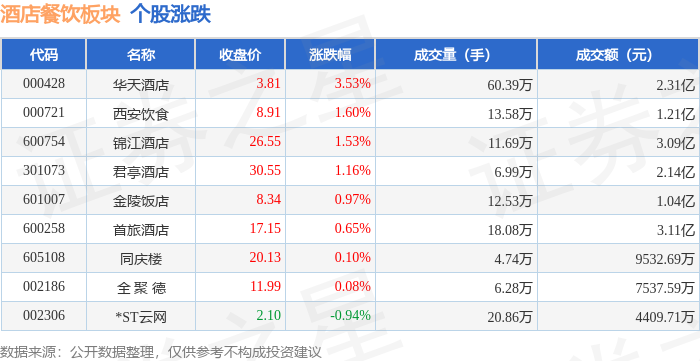 证券之星消息,2月3日酒店餐饮板块较上一交易日上涨1.1%,华天酒店领涨。当日上证指数报收于 4067.74,上涨1.29%。深证成指报收于14127.1,上涨2.19%。酒店餐饮板块个股涨跌见下表: | 代码 | 名称 | 主力净流入(元) | 主力净占比 游资净流入(元) | | 游资净占比 散户净流入 (元) | | 散户净占比 | | --- | --- | --- | --- | --- | --- | --- | --- | | 000428 华天酒店 | | 55.98万 | 0.24% | 639.12万 | 2.77% | -695.10万 | -3.01% | | 601007 | 金陵饭店 | -156.64万 | -1.50% | 16.31万 | 0.16% | 140.33万 | 1.35% | | 000721 西安饮食 | | -258.58万 | -2.14% | -639.05万 | -5.30% | 897.64万 | 7.44% | | 002186 | 全聚德 | -302.05万 | -4.01% | -66.15万 | -0.88% | 368.20万 | 4.8 ...