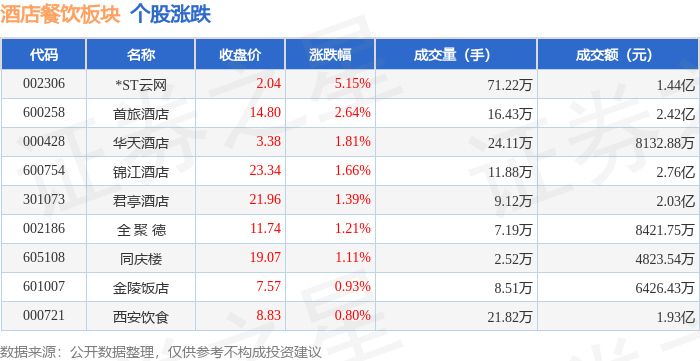 证券之星消息,11月5日酒店餐饮板块较上一交易日上涨1.83%,*ST云网领涨。当日上证指数报收于 3969.25,上涨0.23%。深证成指报收于13223.56,上涨0.37%。酒店餐饮板块个股涨跌见下表: | 代码 | 名称 | 收盘价 | 涨跌幅 | 成交量(手) | 成交额(元) | | --- | --- | --- | --- | --- | --- | | 002306 | *ST云网 | 2.04 | 5.15% | 71.22万 | 1.44亿 | | 600258 | 首旅酒店 | 14.80 | 2.64% | 16.43万 | 2.42 Z | | 000428 | 华天酒店 | 3.38 | 1.81% | 24.11万 | 8132.88万 | | 600754 | 锦江酒店 | 23.34 | 1.66% | 11.88万 | 2.76亿 | | 301073 | 君喜酒店 | 21.96 | 1.39% | 9.12万 | 2.03亿 | | 002186 | 全聚德 | 11.74 | 1.21% | 7.19万 | 8421.75万 | | 605108 | 同庆楼 | 1 ...