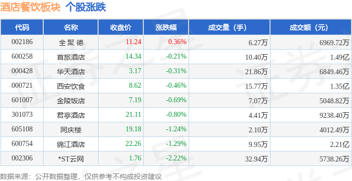 | 代码 | 名称 | 收盘价 | 涨跌幅 | 成交量(手) | 成交额(元) | | --- | --- | --- | --- | --- | --- | | 002186 | 全聚德 | 11.24 | 0.36% | 6.27万 | 6969.72万 | | 600258 | 首旅酒店 | 14.34 | -0.21% | 10.40万 | 1.49 乙 | | 000428 | 华天酒店 | 3.17 | -0.31% | 21.86万 | 6849.46万 | | 000721 | 西安饮食 | 8.62 | -0.46% | 15.77万 | 1.35 Z | | 601007 | 金陵饭店 | 7.19 | -0.69% | 7.07万 | 5048.82万 | | 301073 | 君喜酒店 | 21.11 | -0.80% | 4.41万 | 9238.40万 | | 605108 | 同庆楼 | 19.18 | -1.24% | 2.10万 | 4012.49万 | | 600754 | 锦江酒店 | 22.26 | -1.29% | 9.95万 | 2.21亿 | | 002306 | ...