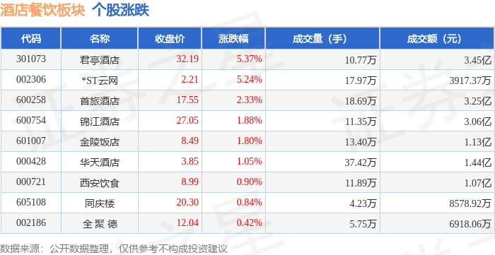 证券之星消息,2月4日酒店餐饮板块较上一交易日上涨2.09%,君亭酒店领涨。当日上证指数报收于 4102.2,上涨0.85%。深证成指报收于14156.27,上涨0.21%。酒店餐饮板块个股涨跌见下表: | 代码 | 名称 | 收盘价 | 涨跌幅 | 成交量(手) | 成交额(元) | | --- | --- | --- | --- | --- | --- | | 301073 | 君亭酒店 | 32.19 | 5.37% | 10.77万 | 3.45 Z | | 002306 | *ST云网 | 2.21 | 5.24% | 17.97万 | 3917.37万 | | 600258 | 首旅酒店 | 17.55 | 2.33% | 18.69万 | 3.25亿 | | 600754 | 锦江酒店 | 27.05 | 1.88% | 11.35万 | 3.06亿 | | 601007 | 金陵饭店 | 8.49 | 1.80% | 13.40万 | 1.13亿 | | 000428 | 华天酒店 | 3.85 | 1.05% | 37.42万 | 1.44亿 | | 000721 | 西安饮食 | 66'8 ...