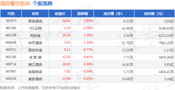 从资金流向上来看,当日酒店餐饮板块主力资金净流出1.18亿元,游资资金净流出7047.89万元,散户资 金净流入1.88亿元。酒店餐饮板块个股资金流向见下表: | 代码 | 名称 | 主力净流入(元) | 主力净占比 游资净流入 (元) | | 游资净占比 散户净流入 (元) | | 散户净占比 | | --- | --- | --- | --- | --- | --- | --- | --- | | 000428 华天酒店 | | 1036.53万 | 11.30% | -249.35万 | -2.72% | -787.18万 | -8.58% | | 605108 | 同庆楼 | -17.51万 | -0.30% | -250.88万 | -4.23% | 268.40万 | 4.52% | | 601007 | 金陵饭店 | -111.78万 | -1.56% | -514.57万 | -7.16% | 626.36万 | 8.72% | | 301073 君亭酒店 | | -297.80万 | -2.39% | -428.16万 | -3.43% | 725.96万 | 5.82% | | 00230 ...