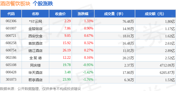 | 代码 | 名称 | 收盘价 | 涨跌幅 | 成交量(手) | 成交额(元) | | --- | --- | --- | --- | --- | --- | | 002306 | *ST云网 | 2.26 | 1.35% | 46.48万 | 1.05亿 | | 600754 | 锦江酒店 | 26.12 | 0.35% | 14.53万 | 3.80亿 | | 600258 | 首旅酒店 | 15.87 | 0.19% | 16.71万 | 2.66亿 | | 601007 | 金陵饭店 | 7.79 | -0.38% | 8.94万 | 6945.84万 | | 000428 | 华天酒店 | 3.53 | -0.56% | 19.10万 | 6708.38万 | | 002186 | 全聚德 | 12.20 | -0.73% | 9.37万 | 1.15亿 | | 605108 | 同庆楼 | 19.97 | -1.53% | 2.07万 | 4134.98万 | | 000721 | 西安饮食 | 66.8 | -1.53% | 15.27万 | 1.37亿 | | 301073 | 君喜酒店 | ...