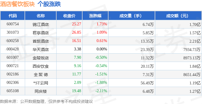 证券之星消息,12月24日酒店餐饮板块较上一交易日下跌0.05%,锦江酒店领跌。当日上证指数报收于 3940.95,上涨0.53%。深证成指报收于13486.42,上涨0.88%。酒店餐饮板块个股涨跌见下表: | 代码 | 名称 | 收盘价 | 涨跌幅 | 成交量(手) | 成交额(元) | | --- | --- | --- | --- | --- | --- | | 002306 | *ST云网 | 2.03 | 5.18% | 6.47万 | 1313.49万 | | 000428 | 华天酒店 | 3.42 | 1.48% | 32.25万 | 1.09亿 | | 600258 | 首旅酒店 | 16.58 | 1.47% | - 19.99万 | 3.29 乙 | | 000721 | 西安饮食 | 9.22 | 0.11% | 22.51万 | 2.06亿 | | 301073 | 君享酒店 | 27.00 | -0.48% | 7.34万 | 2666T | | 601007 | 金陵饭店 | 7.87 | -0.88% | 16.89万 | 1.32亿 | | 605108 | 同庆楼 | 1 ...