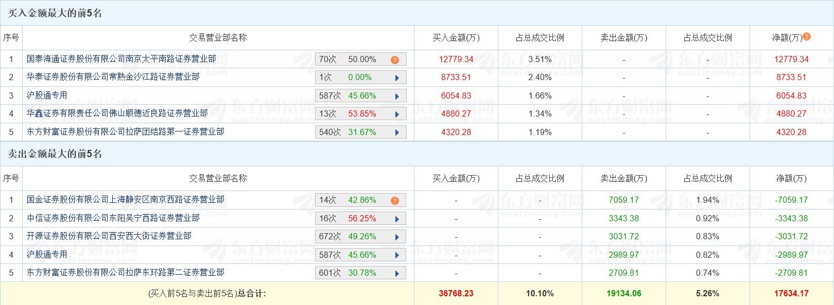 | 序号 | 交易营业部名称 | | 买入金额(万) | 占总成交比例 | | --- | --- | --- | --- | --- | | 1 | 国金证券股份有限公司上海静安区南京西路证券营业部 | 14次 42.86% 2 | | | | 2 | 中信证券股份有限公司东阳吴宁西路证券营业部 | 16次 56.25% | | | | 3 | 开源证券股份有限公司西安西大街证券营业部 | 672次 49.26% | | | | 4 | 沪股通专用 | 587次 45.66% | | | | 5 | 东方财富证券股份有限公司拉萨东环路第二证券营业部 | 601次 30.78% | | | | | (买入前5名与卖出前5名)总合计: | | 36768.23 | 10.10% | 格隆汇11月20日|此前3连板涨停的浪潮软件(600756.SH)今日跌5.58%,换手率45.73%,成交额36.41亿元。龙虎榜数据显示,游资"作手新一"位列买一席 位,买入1.28亿元;"量化打板"位列卖三席位,卖出3032万元;沪股通位列买三席位,买入6055万元。(格隆汇) | 买入金额最大的前5名 | | | | | | ...