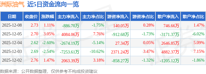 证券之星消息,截至2025年12月8日收盘,洲际油气(600759)报收于2.73元,上涨1.11%,换手率 4.48%,成交量185.6万手,成交额5.07亿元。 12月8日的资金流向数据方面,主力资金净流出886.7万元,占总成交额1.75%,游资资金净流入140.05 万元,占总成交额0.28%,散户资金净流入746.66万元,占总成交额1.47%。 该股主要指标及行业内排名如下: | 指标 | 洲际油气 | 石油行业均值 | 行业排名 | | --- | --- | --- | --- | | 总市值 | 113.27亿元 | 2126.97亿元 | 61 8 | | 净资产 | 89.23亿元 | 1921.21亿元 | 61 16 | | 净利润 | 8307.61万元 | 136.37亿元 | 618 | | 市盈率(动) | 102.26 | 34.16 | 61 OF | | 市净率 | 1.29 | 2.51 | 7 19 | | 毛利率 | 56.44% | 18.66% | 61 I | | 净利率 | 7% | 4.47% | 4 19 | | ROE | 0.95% | 1.3% ...