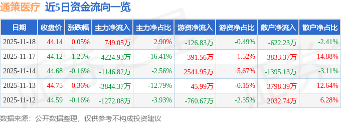 证券之星消息,截至2025年11月18日收盘,通策医疗(600763)报收于44.14元,上涨0.05%,换手率 1.3%,成交量5.82万手,成交额2.59亿元。 11月18日的资金流向数据方面,主力资金净流入749.05万元,占总成交额2.9%,游资资金净流出126.83 万元,占总成交额0.49%,散户资金净流出622.23万元,占总成交额2.41%。 近5日资金流向一览见下表: | | | | | 日期 收盘价 涨跌幅 主力净流入 主力净占比 游资净占比 散户净流入 散户净占比 | | | | | | --- | --- | --- | --- | --- | --- | --- | --- | --- | | 2025-11-18 | 44.14 0.05% | | 749.05万 | 2.90% | -126.83万 | -0.49% | -622.23万 | -2.41% | | 2025-11-17 | 44.12 | -1.25% | -4224.93万 | -16.41% | 391.56万 | 1.52% | 3833.37万 | 14.88% | | 2025-11-14 | 44.6 ...