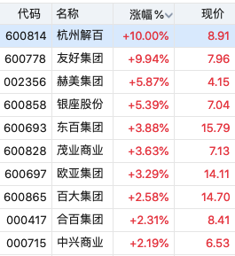 | 代码 | 名称 | 收盘价 | 涨跌幅 | 成交量(手) | 成交额(元) | | | --- | --- | --- | --- | --- | --- | --- | | 600814 | 杭州解百 | 8.91 | 10.00% | 36.42万 | | 3.15亿 | | 600778 | 友好集团 | 7.96 | 9.94% | 35.32万 | | 2.75亿 | | 600858 | 银座股份 | 7.03 | 5.24% | 41.52万 | 1 | 2.89亿 | | 002356 | 赫美集团 | 4.12 | 5.10% | 108.82万 | | 4.4917 | | 600693 | 东自集团 | 15.91 | 4.67% | 125.05万 | | 19.67亿 | | 603682 | 锦和商管 | 7.10 | 4.41% | 15.95万 | | 1.11亿 | | 000417 | 合百集团 | 8.47 | 3.04% | 35.11万 | | 2.94亿 | | 600697 | 欧亚集团 | 14.07 | 3.00% | 10.37万 | | 1.46亿 | ...