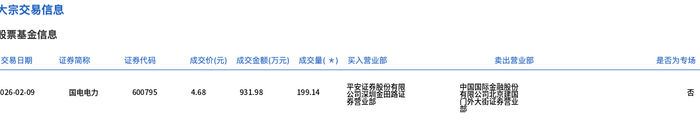 2月9日,国电电力大宗交易成交199.14万股,成交额931.98万元,占当日总成交额的1.02%,成交价4.68 元,较市场收盘价4.68元持平。 | 反崇参立 日志 | | | | | | | | --- | --- | --- | --- | --- | --- | --- | | 交易日期 | 证券简称 | 证券代码 | 成交价(元) 成交金额(万元) 成交量( * ) 买入营业部 | | | 卖出营业部 是否为专场 | | 026-02-09 | 国电电力 | 600795 | 4.68 931.98 | 199.14 | 芬蘭曼國家國家區 | 顏榮載購 ко | ...