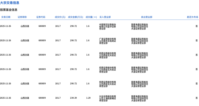 (文章来源:证券时报网) 11月25日山西汾酒大宗交易一览 山西汾酒11月25日大宗交易平台共发生2笔成交,合计成交量4.20万股,成交金额761.92万元。成交价格 均为181.41元,相对今日收盘价折价6.00%。 | 成交量 (万 | 成交金额 (万元) | 成交价 格 | 相对当日收盘 折溢价(%) | 买方营业部 | 卖方营业部 | | --- | --- | --- | --- | --- | --- | | 股) | | (元) | | | | | 3.00 | 544.23 | 181.41 | -6.00 | 国泰海通证券股份有 | 国泰海通证券股份有限公司深 | | | | | | 限公司总部 | 圳滨河大道证券营业部 | | 1.20 | 217.69 | 181.41 | -6.00 | 中国中金财富证券有 | 国泰海通证券股份有限公司深 | | | | | | 限公司深圳分公司 | 圳滨河大道证券营业部 | 进一步统计,近3个月内该股累计发生189笔大宗交易,合计成交金额为28.42亿元。 证券时报·数据宝统计显示,山西汾酒今日收盘价为192.99元,上涨0.31%,日换手率为0.3 ...