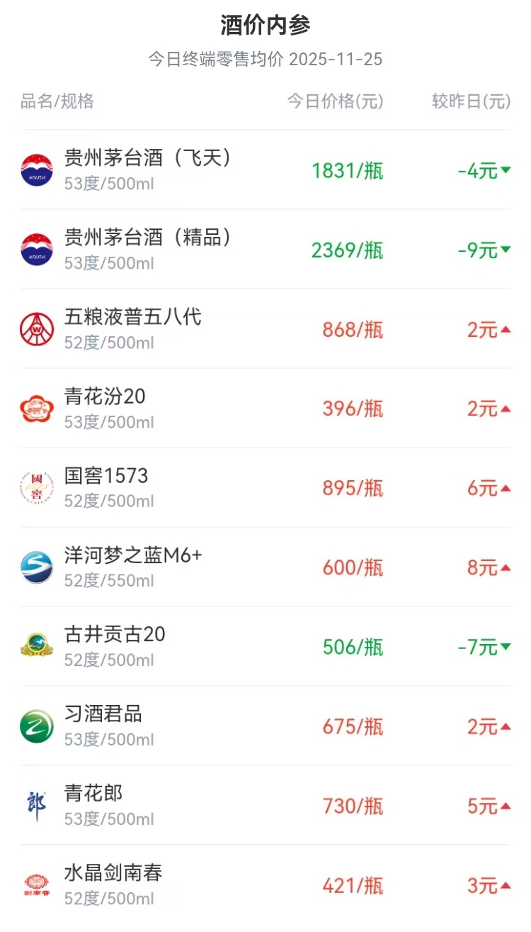 酒价内参11月25日价格发布 市场整体续涨青花郎五连阳