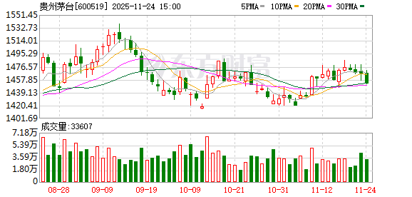 11只白酒股上涨 贵州茅台1452元/股收盘