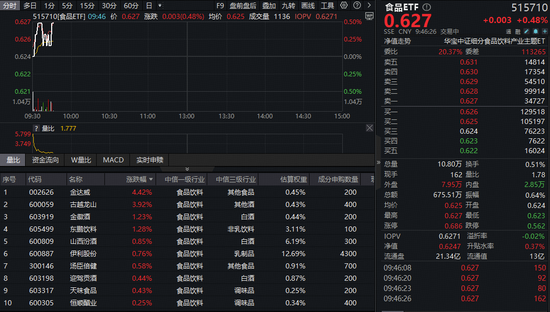 吃喝板块今日(10月16日)延续攻势,反映吃喝板块整体走势的食品ETF(515710)开盘后持续红盘震 荡,截至发稿,场内价格涨0.48%。 从估值方面来看,吃喝板块估值仍处低位,当前或为板块较好配置时机。数据显示,截至昨日(10月15 日)收盘,食品ETF(515710)标的指数细分食品指数市盈率为20.58倍,位于近10年来7.05%分位点的 低位,中长期配置性价比凸显。 展望后市,国信证券表示,看多食品饮料板块。目前板块呈现"低基数、低持仓、低预期"的特点,任何 供需两端的变化均有可能催化股价上行,近期外需风险增加,内需弹性板块或率先回暖,推荐三季报预 期业绩高增板块,比如零食、饮料、速冻食品等。 中信建投指出,国家倡导反内卷,有利于价格完成筑底,长期有利于高质量发展,提升了资本市场对未 来经济发展和消费预期。随着政策纠偏持续,低位白酒餐饮链有望回暖。当前白酒板块估值低位,茅台 动销有所回暖,板块底部机会值得珍视。 成份股方面,大众品涨幅居前,部分白酒股亦表现亮眼。截至发稿,金达威大涨超4%,古越龙山涨超 3%,金徽酒、东鹏饮料双双涨超1%,贵州茅台、山西汾酒、伊利股份等亦小幅飘红。 | | | 分时 ...