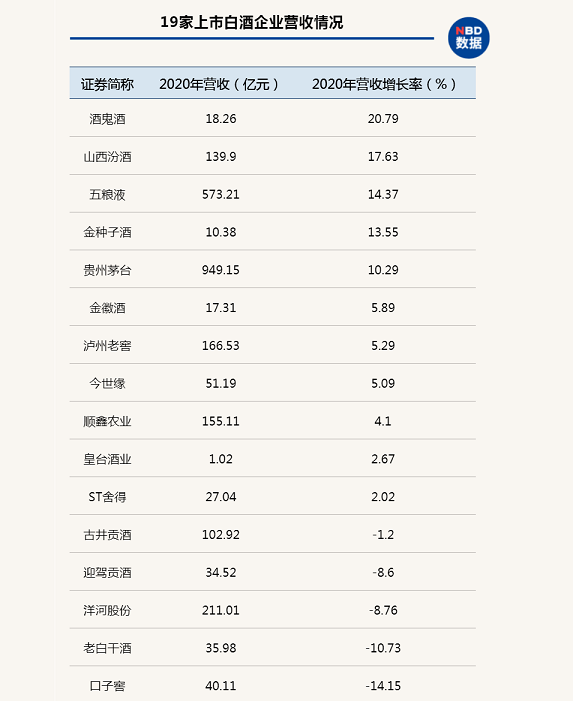 2020年是国内股市的大牛市,A股走出独立行情,一度领涨全球。市场交投活跃,而纵观所有行业,白酒无疑是最受关注的板块之一。 截至2021年4月30日,19家上市白酒企业已全部发布了2020年年报。这19家上市白酒企业共实现营收2589.36亿元,同比增长6.58%;同期归母净利润共 920.68亿元,相比上年增幅为11.95%。 从整体来看,去年受疫情影响,19家白酒上市公司的业绩整体增速较上一年有所下滑。在业绩增速下滑的同时,各大白酒上市公司的分化也在加剧,甚至百 亿级别的酒企也有分化的趋势。整体来看,山西汾酒和酒鬼酒表现较好,去年这两家公司的股价涨幅也超过3倍,位居行业TOP3之中。 每经记者|朱万平 每经编辑|文多 营收从暴跌39.07%到最高增长20.79% 2020年,白酒板块弯道超车,整体涨幅跃居A股大类板块首位。但从年报来看,名优酒企与区域酒企的营收增速(同比,下同)之间,出现分化加剧的情 况。去年,19家白酒上市公司中,11家营收增幅为正,其余8家均为负增长;营收增幅最高的酒鬼酒,达到20.79%,最低为青青稞酒为-39.07%,两者相差高 达59.86个百分点。 | | 19家上市白酒企业营 ...