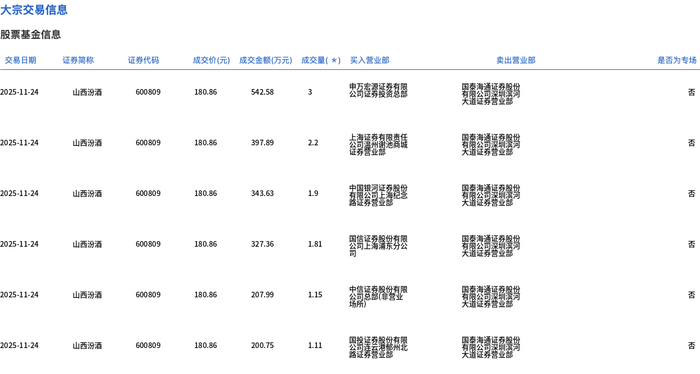 11月24日,山西汾酒大宗交易成交11.17万股,成交额2020.2万元,占当日总成交额的2.62%,成交价 180.86元,较市场收盘价192.4元折价6%。 | 交易日期 | 证券简称 | 证券代码 | | | 成交价(元) 成交金额(万元) 成交量(*) 买入营业部 | | 卖出营业部 | 是否为专场 | | --- | --- | --- | --- | --- | --- | --- | --- | --- | | 2025-11-24 | 山西湖道 | 600809 | 180.86 | 542.58 | 3 | 2006 - 100 | 新本市场 | 물 | | 2025-11-24 | 山西湖夏 | 600809 | 180.86 | 397.89 | 2.2 | | 看顾与同作影 | KI | | 2025-11-24 | 山西汾酒 | 600809 | 180.86 | 343.63 | 1.9 | | | る | | 2025-11-24 | 山西湖道 | 600809 | 180.86 | 327.36 | 1.81 | 图片 3 2 3 2 3 2 3 2 3 2 3 2 | | 절 ...