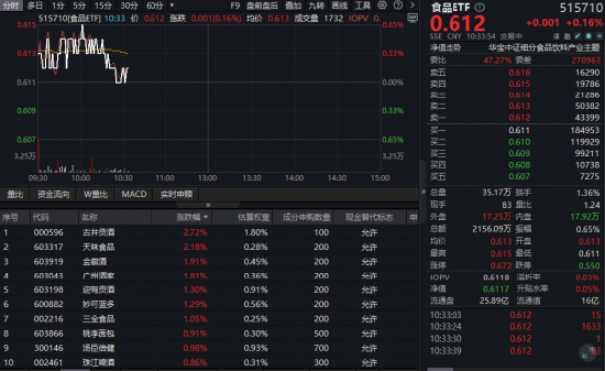 成份股方面,大众品涨幅居前,部分白酒股亦表现不俗。截至发稿,古井贡酒、天味食品双双大涨超 2%,金徽酒、广州酒家、迎驾贡酒、妙可蓝多等多股跟涨超1%。 吃喝板块今日(11月24日)震荡盘整。反映吃喝板块整体走势的食品ETF(515710)盘中多数时间红盘 震荡,场内价格最高涨0.65%,后有所回落,截至发稿,涨0.16%。 | 分时 多日 1分 5分 15分 30分 60分 ▼ | F9 盘前盘后 盘加 九转 画线 工具 @ 00 | 食品ETF O | 515710 | 5157101食品ETFI 10:33 价 0.512 温庆 0.0010.16%) 均价 0.613 版交量 1732 IDPV | 0.67 | +0.001 +0.16% | | | | | | | | | | | | | | | | --- | --- | --- | --- | --- | --- | --- | --- | --- | --- | --- | --- | --- | --- | --- | --- | --- | --- | --- | --- | --- | | 0.01 | SSE CNY 10:33:54 ...