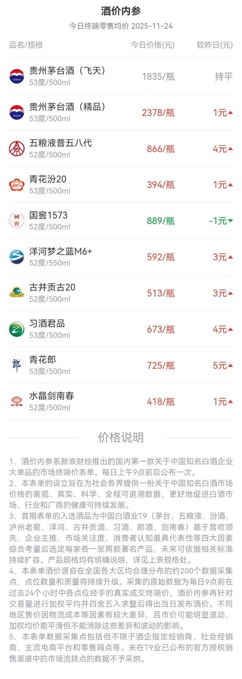 酒价内参11月24日价格发布 整体价格延续升势青花郎领涨五连阳