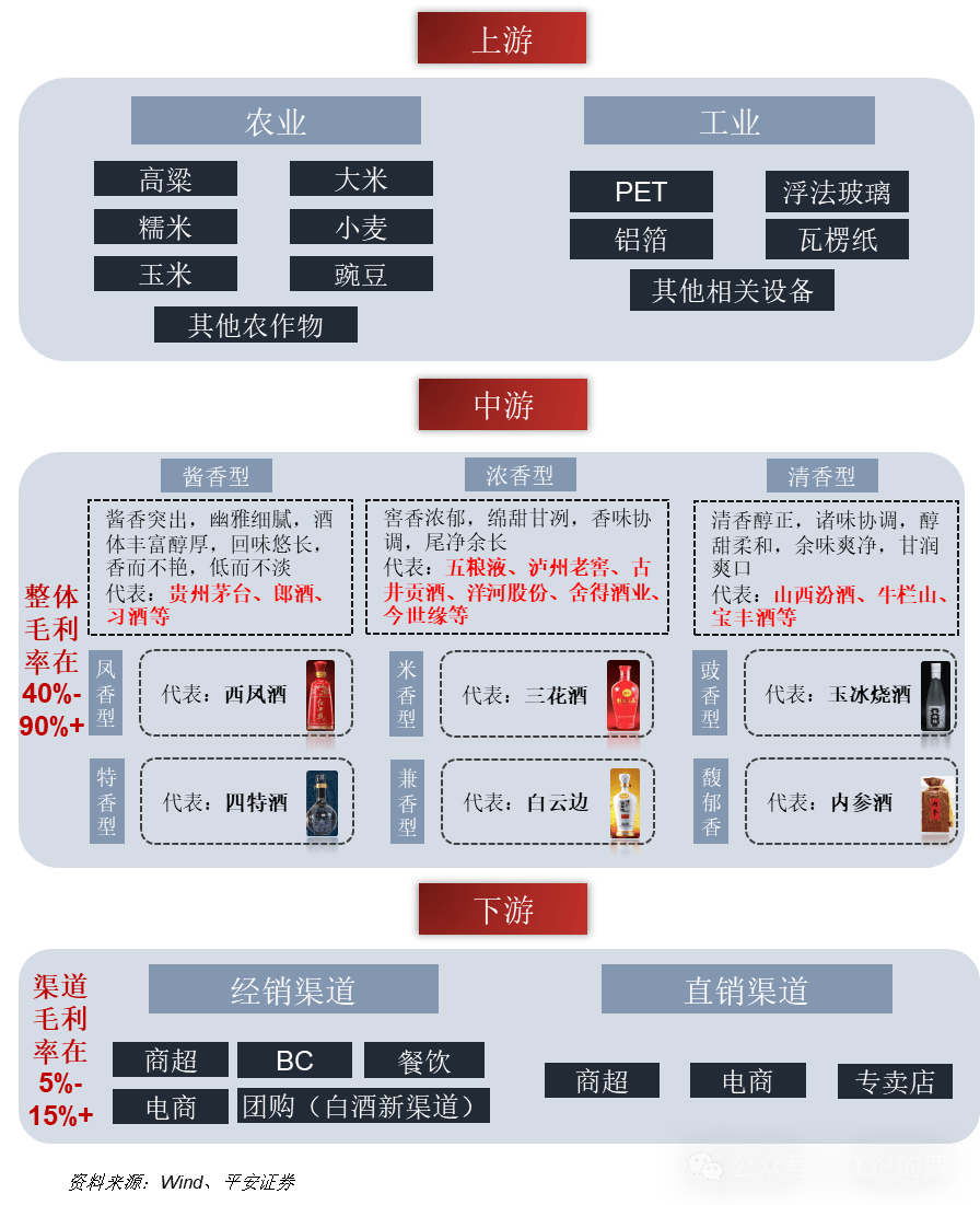 02 白酒简介 02-1、白酒类别 不同香型的原料与工艺虽有差异,但高粱如同白酒酿造的 "核心基石"—— 浓香、酱香、清香等主流香型均以高粱为核心原料,12 种香型中仅特香、豉香 不含高粱,且二者市场占比极低。 白酒香型体系的建立始于 1979 年第三次全国评酒会,此次评酒会首次按香型评比,确立了浓香、清香、酱香、米香四大基本香型,如同搭建起香型体系 的 "基础框架"。后续随着生产工艺升级、风味特征分化,在四大基本香型的基础上交融演化出另外八种香型,最终形成十二种香型的完整格局。 | | 清香型 | 液香型 | 酱香型 | 米香型 | | --- | --- | --- | --- | --- | | 原料 | 高梁 | 高梁/多粮混合 | 高梁及小麦 | 大米 | | 生产工艺 | 清蒸清烧、二次清 | 四次投粮、蒸煮、 | 一年制酒、两次投 料、九次蒸煮、八 次发酵、七次取酒, | 固态糖化,半固态 发酵,釜式间接加 | | | | 投曲、发酵 | | | | | | | 窖藏后经过多轮次 | 热蒸馏 | | | | | 勾兑 | | | 发酵设备 | 陶瓷地紅 | 泥窖 | 石窖泥底 | 陶紅 | | ...