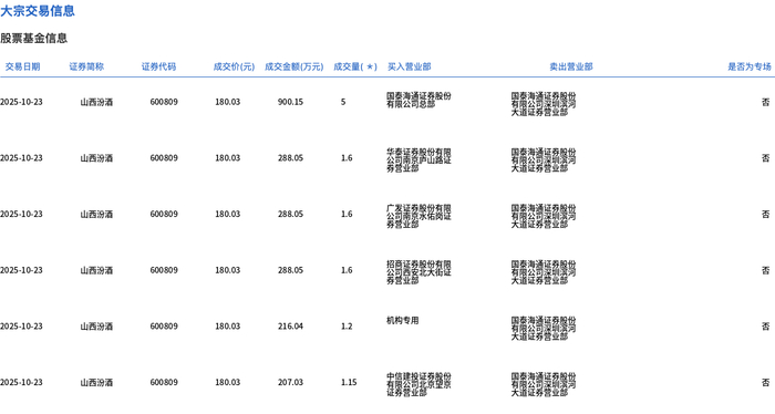 炒股就看金麒麟分析师研报,权威,专业,及时,全面,助您挖掘潜力主题机会! 10月22日,山西汾酒收跌0.74%,收盘价为188.31元,发生10笔大宗交易,合计成交量121.82万股,成 交金额2.19亿元。 第9笔成交价格为180.00元,成交1.15万股,成交金额207.00万元,溢价率为-4.41%,买方营业部为机构 专用,卖方营业部为国泰海通证券股份有限公司深圳滨河大道证券营业部。 第10笔成交价格为180.00元,成交1.12万股,成交金额201.60万元,溢价率为-4.41%,买方营业部为机 构专用,卖方营业部为国泰海通证券股份有限公司深圳滨河大道证券营业部。 进一步统计,近3个月内该股累计发生58笔大宗交易,合计成交金额为7.97亿元。该股近5个交易日累计 下跌2.56%,主力资金合计净流出6479.57万元。 第4笔成交价格为180.00元,成交29.55万股,成交金额5,319.00万元,溢价率为-4.41%,买方营业部为机 构专用,卖方营业部为国泰海通证券股份有限公司深圳滨河大道证券营业部。 第5笔成交价格为180.00元,成交8.00万股,成交金额1,440.00万元,溢价率为-4.41 ...