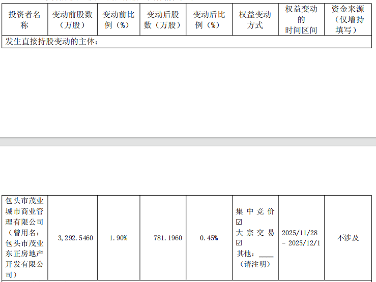 南方财经12月2日电,茂业商业(600828.SH)发布公告称,公司控股股东一致行动人包头市茂业城市商业 管理有限公司于2025年11月28日至2025年12月1日期间,通过集中竞价及大宗交易方式合计减持公司股 份2511.35万股,占公司总股本的1.45%。本次减持前,包头茂业商管及其一致行动人合计持有公司股份 1,497,380,497股,占总股本的86.45%;减持后持股数量降至1,472,266,997股,持股比例为85.00%。其 中,包头茂业商管直接持股比例由1.90%下降至0.45%。 ...