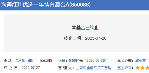 海通红利优选一年持有混合清盘 成立4年半亏损逾2成