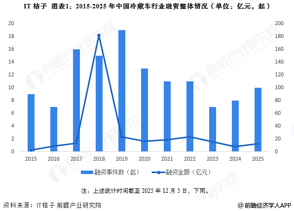 转自:前瞻产业研究院 以下数据及分析来自于前瞻产业研究院冷藏车研究小组发布的《中国冷藏车行业市场需求前景与投资规 划分析报告》 行业主要上市公司:中集车辆(301039)、中国重汽(000951)、福田汽车(600166)、东风汽车(600006)、江 淮汽车(600418)、江铃汽车(000550)、一汽解放(000800)、动力新科(600841)等。 本文核心数据:行业整体融资;行业投融资轮次 1、冷藏车行业投融资活跃度呈波动态势 根据IT桔子库,2015-2025年期间,我国冷藏车行业投融资事件数量呈现波动态势,2024年融资事件为8 件,2025年截至12月,投融资事件数量为10件。2018年,冷藏车行业投融资金额较高,达到182亿元, 其余年份较为平均。 注:上述统计时间截至2025年12月5日,下同。 2、冷藏车行业投融资集中于战略投资 从平均单笔融资金额来看,2018-2025年,冷藏车行业平均单笔融资金额呈波动趋势。2024年平均单笔 融资金额仅0.94亿元,2025年中国冷藏车行业平均单笔融资金额略升至1.25亿元。 从冷藏车的投资轮次分析,目前冷藏车行业的融资轮次中,主要集中在A轮、战略 ...