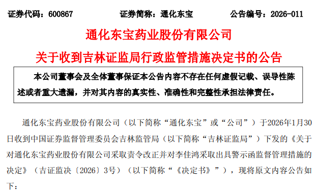 南财智讯1月30日电,通化东宝公告,通化东宝药业股份有限公司及董事长李佳鸿收到《关于对通化东 宝药业股份有限公司采取责令改正并对李佳鸿采取出具警示函监督管理措施的决定》(吉证监决 〔2026〕3号)。经查,公司与控股股东东宝实业集团股份有限公司存在部分房产互相混用情况,双方 未签订租赁协议、未支付租金,导致上市公司独立性不足,违反《上市公司治理准则》相关规定;李佳 鸿作为董事长对上述违规行为负主要责任。吉林证监局决定对公司采取责令改正措施,对李佳鸿采取出 具警示函措施,并记入证券期货市场诚信档案;要求公司及李佳鸿于收到决定书之日起30日内提交书面 整改方案。 ...