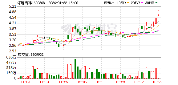 声明:市场有风险,投资需谨慎。本文为AI大模型基于第三方数据库自动发布,任何在本文出现的信 息(包括但不限于个股、评论、预测、图表、指标、理论、任何形式的表述等)均只作为参考,不构成 个人投资建议。受限于第三方数据库质量等问题,我们无法对数据的真实性及完整性进行分辨或核验, 因此本文内容可能出现不准确、不完整、误导性的内容或信息,具体以公司公告为准。如有疑问,请联 系biz@staff.sina.com.cn。 责任编辑:小浪快报 2026年1月21日,梅雁吉祥(sh600868)触及涨停,涨停价4.52元,涨幅9.98%,总市值85.80亿元,流通 市值85.80亿元,截止发稿,总成交额12.68亿元。 根据喜娜AI异动分析,梅雁吉祥涨停原因可能如下,公司治理优化+矿产资源进展+水电概念: 1、公司 积极优化治理结构,完成董事会换届,设立专门委员会,采用新履职模式符合新《公司法》要求。同时 高管薪酬与业绩深度绑定,还强化了中小股东权益保护,这些举措为公司长远发展奠定良好基础,提升 了市场信心,是股价涨停的重要内部因素。 2、据公司公告,其全资子公司锑银矿储量评审备案获自然 资源部受理,尽管存在审批不确定性, ...