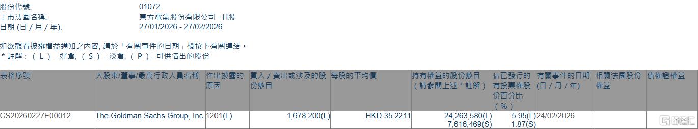 | 股份代號: | 01072 | | --- | --- | | 上市法國名稱: | 東方電氣股份有限公司 - H股 | | 日期 (日 / 月 / 年): | 27/01/2026 - 27/02/2026 | | 表格序號 | 大股東/董事/最高行政人員名稱 作出披露的 買入 / 南出或涉及的股 屈股的平均價 | | | 特有權益的股份數目 | 佔已發行的 有關事 | | --- | --- | --- | --- | --- | --- | | | 防敷 三 | | | (請參閱上述 *註解) 有投票權股 (日 / F | | | | | | | | 分高分明 | | CS20260227E00012 | The Goldman Sachs Group, Inc. 1201(L) | 1,678,200(L | HKD 35.2211 | 24.263,580(L | 5.95(L)24/02/1 | | | | | | 7,616,469(S) | 1.87(S) | 格隆汇2月27日丨根据联交所最新权益披露资料显示,2026年2月24日,东方电气(01072.HK)遭The Goldman Sac ...