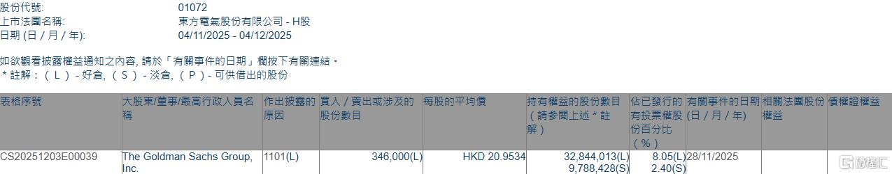 The Goldman Sachs Group, Inc.增持东方电气34.6万股 每股作价约20.95港元