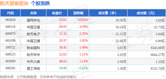 | 代码 | 名称 | 收盘价 | 涨跌幅 | 成交量(手) | 成交额(元) | | --- | --- | --- | --- | --- | --- | | 002829 | 星网宇达 | 25.61 | 10.01% | 10.50万 | 2.65亿 | | 600118 | 中国卫星 | 38.05 | 3.59% | 59.24万 | 22.73亿 | | 600879 | 航天电子 | 11.32 | 2.35% | 51.31万 | 5.84亿 | | 601698 | 中園 望通 | 20.97 | 1.65% | - 32.68万 | 6.89 Z | | 300722 | 新余国科 | 30.45 | 1.40% | 3.07万 | 9343.08万 | | 688523 | 航天坏宇 | 22.62 | 1.21% | 2.92万 | 6664.27万 | | 003009 | 中天火箭 | 48.65 | 1.12% | 2.50万 | 1.22亿 | | 688282 | 理工导航 | 58.80 | -1.01% | 1.38万 | 8125.74万 | 从资金流向上来看,当日航 ...