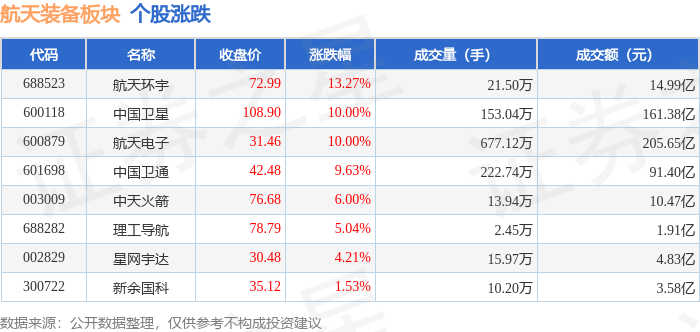 | 名称 | 相关 | 醫療校 学院 | | | --- | --- | --- | --- | | 奢创微纳 | 详情 数据 股吧 | 123.31 | 20.00% | | 航宇微 | 详情 数据 股吧 | 23.84 | 17.44% | | 臻墙科技 | 详情 数据 股吧 | 211.16 | 17.35% | | 信维通信 | 详情 数据 股吧 | 92.14 | 13.75% | | 乾脂光电 | 详情 数据 股吧 | 37.03 | 13.45% | | 中科星图 | 详情 数据 股吧 | 84.11 | 12.63% | | 航天环宇 | 详情 数据 股吧 | 71.70 | 11.27% | | 天银机电 | 详情 数据 股吧 | 61.74 | 10.05% | | 久之洋 | 详情 数据 股吧 | 77.04 | 10.01% | | 航天电子 | 详情 数据 股吧 | 31.46 | 10.00% | | 隆火通信 | 详情 数据 股吧 | 41.82 | 9.99% | | 通宇通讯 | 详情 数据 股吧 | 52.17 | 9.99% | | 三维通信 | 详情 数据 股吧 | 1 ...