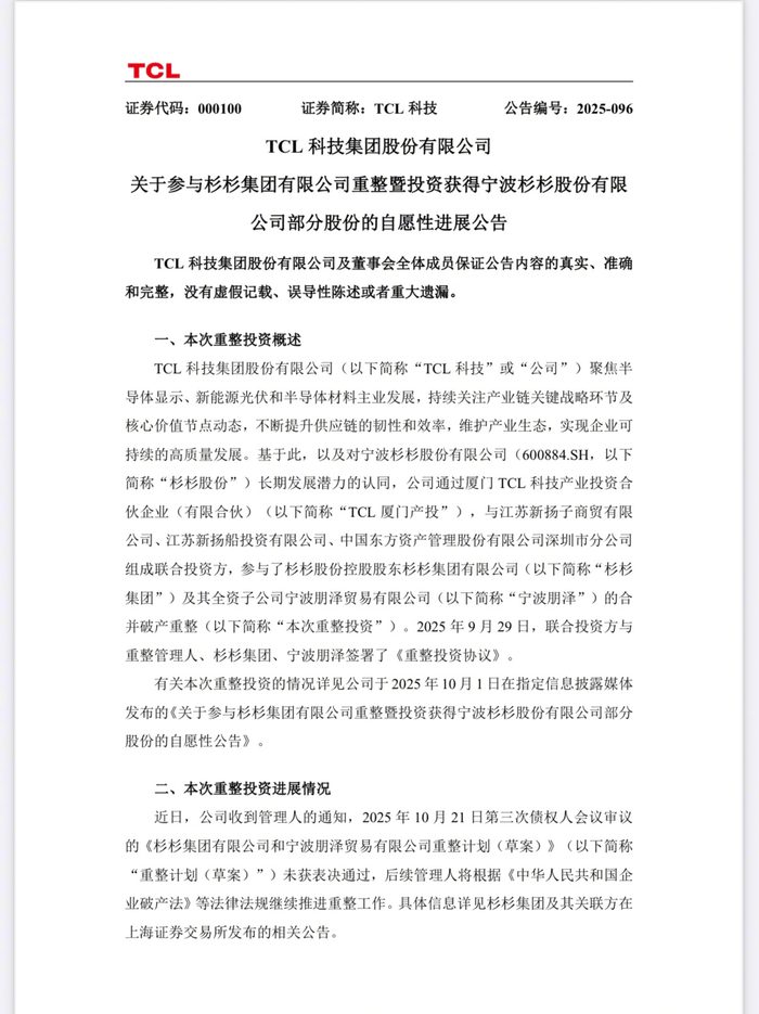 Group 1 - The core viewpoint of the article is that TCL Technology Group is actively involved in the restructuring investment of Ningbo Shanshan Co., Ltd. and its subsidiaries, aiming for sustainable high-quality development in semiconductor display, new energy photovoltaic, and semiconductor materials [2][3] - TCL Technology, through its investment partnership, has joined forces with other investors to participate in the bankruptcy restructuring of Shanshan Group and its wholly-owned subsidiary, Ningbo Pengze Trading Co., Ltd. [2] - The restructuring investment agreement was signed on September 29, 2025, indicating a strategic move to enhance supply chain resilience and efficiency [2] Group 2 - Recently, the management notified that the draft restructuring plan was not approved in the third creditors' meeting held on October 21, 2025, and further actions will be taken according to relevant laws [3] - The company will continue to fulfill its information disclosure obligations based on the progress of the restructuring investment [6]