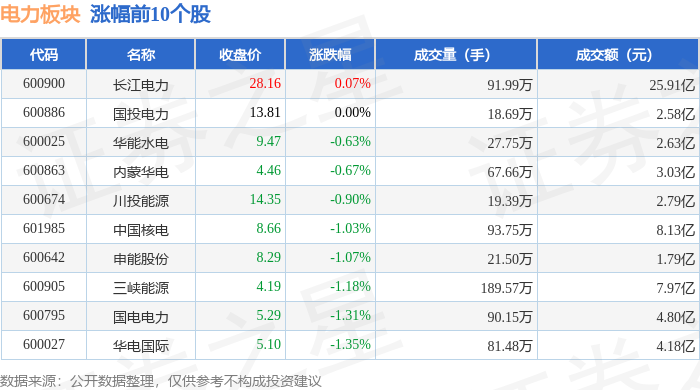 证券之星消息,11月21日电力板块较上一交易日下跌1.91%,世茂能源领跌。当日上证指数报收于3834.89,下跌2.45%。深证成指报收于 12538.07,下跌3.41%。电力板块个股涨跌见下表: | | | | 代码 | 名称 | 收盘价 | 涨跌幅 | 成交量(手) | 成交额(元) | | --- | --- | --- | --- | --- | --- | | 600900 | 长江电力 | 28.16 | 0.07% | 91.99万 | 25.91亿 | | 600886 | 国投电力 | 13.81 | 0.00% | 18.69万 | 2.58亿 | | 600025 | 华能水电 | 9.47 | -0.63% | 27.75万 | 2.63亿 | | 600863 | 内蒙华电 | 4.46 | -0.67% | 67.66万 | 3.03亿 | | 600674 | 川投能源 | 14.35 | -0.90% | 19.39万 | 2.79亿 | | 601985 | 中国核电 | 8.66 | -1.03% | 93.75万 | 8.13亿 | | 600642 | 申能股份 | ...