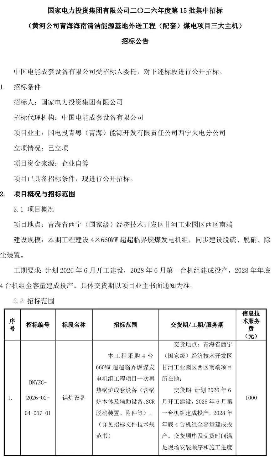 近日,国家电投发布国家电力投资集团有限公司二〇二六年度第 15批集中招标(黄河公司青海海南清洁能源基地外送工程(配套)煤电 项目三大主机)招标公告,项目地点:青海省西宁(国家级)经济技术开发区甘河工业园区西区南端,建设规模:本期工程建设4×660MW 超超临界燃煤发电机组,同步建设脱硫、脱硝、除尘装置。工期要求:计划 2026年 6月开工建设,2028年 6月第一台机组建成投产, 2028年年底4台机组全容量建成投产。 详情如下: | 府号 | 招标编号 | 标段名称 | 招标范围 | 交货期/工期/服务期 | 信息技 术服务 员 | | --- | --- | --- | --- | --- | --- | | | | | | | (元) | | | | | | 交货地点:青海省西宁 | | | | | | 本工程采购 4台 | (国家级)经济技术开发区 | | | | | | 660MW 超超临界燃煤发 | 甘河工业园区西区南端项目 | | | | DNYZC- | | 电机组工程项目一次再 | 所在地: | | | | | | 热锅炉成套设备(含锅 | 交货期 计划 2026年6 | | (4) 投标人 ...