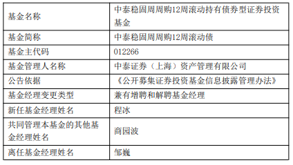 中泰稳固周周购12周滚动债增聘程冰 邹巍离任