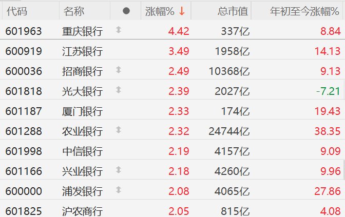 | 代码 | 名标 | | 涨幅% ↓ | 总市值 | 年初至今张幅%。 | | --- | --- | --- | --- | --- | --- | | 601963 | 重庆银行 | 1 | 4.42 | 337亿 | 8.84 | | 600919 | 江苏银行 | | 3.49 | 1958亿 | 14.13 | | 600036 | 招商银行 | 1 | 2.49 | 10368亿 | 9.13 | | 601818 | 光大银行 | 1 | 2.39 | 2027亿 | -7.21 | | 601187 | 厦门银行 | | 2.33 | 174亿 | 19.43 | | 601288 | 农业银行 | + | 2.32 | 24744 Z | 38.35 | | 601998 | 中信銀行 | | 2.19 | 4157亿 | 9.09 | | 601166 | 兴业银行 | 1 | 2.18 | 4260亿 | 9.96 | | 6000000 | 浦发银行 | + | 2.08 | 4065亿 | 27.86 | | 601825 | 沪农商行 | | 2.05 | 815亿 | 4.08 ...