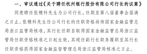 从公开资料可以看出,现任副行长张精科是杭州银行内部培养起来的干部。从复旦大学金融系本科毕业 之后,张精科便加入了杭州银行,历经多个岗位锻炼。他曾担任杭州银行科技支行副行长,杭州银行文 创支行行长,杭州银行资产管理部总经理,杭州银行科技文创金融事业部党委书记、总经理,杭州银行 党委委员、人力资源部总经理。 2023年7月,杭州银行公告聘任其为副行长,同年9月,国家金融监督管理总局浙江监管局核准其副行长 任职资格。 行长一职空缺9个月后,杭州银行决定内部提拔"75后"副行长张精科作为"接棒者"。 1月12日晚间,杭州银行公告称,公司董事会同意聘任张精科为公司行长,任期至第八届董事会届满之 日止,其任职资格待监管部门核准。 记者注意到,张精科是杭州银行内部培养起来的干部,从复旦大学金融系本科毕业之后,他便加入了杭 州银行,从公司客户经理做起,历经多个岗位锻炼。2009年杭州银行成立浙江省首家科技专营支行,张 精科作为该支行筹建班子成员之一,在工作中积累了丰富的经验,亦成为杭州银行科技金融业务的重要 开拓者之一。 新任行长人选来自内部提拔 去年4月初,杭州银行原行长虞利明因个人原因辞任,此后该行董事长宋剑斌代为履行行 ...